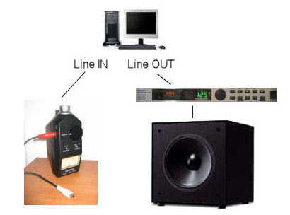 Il suffit de reporter simplement les valeurs sur l'égaliseur Behringer DSP1124P: Étape 4: Mesure de la réponse du caisson égalisé pour vérificationConnexions: La sortie son du PC va à l'entrée de l'égaliseur. La sortie de l'égaliseur va au caisson. L'entrée son du PC Line In est connectée sur le DBMètre: Comme tout à l'heure on règle le range de 10 à 500Hz, le Step à x1.01 pour avoir une mesure précise, on active la "Correct Spl C Curve" si on a un DBMètre Conrad d'origine et on relance la mesure qui dure environ 2 minutes. J'ai laissé la première mesure en noir avant correction pour que je puisse comparer avant/après, la nouvelle mesure corrigée est bien entendu celle en rouge: La mesure de la réponse réelle correspond finalement assez bien à la réponse 'théorique' trouvée avec CorrectPlot Bien sûr la réponse n'est pas parfaite, il reste quelques trous/bosses que l'on peut fignoler, mais le plus gros est fait, la réponse est à peu près plate entre 20 et 200Hz. Vous pouvez télécharger mon fichier de mesure avec égaliseur en marche: Corrected.txt Une fois que les mesures correspondent à ce que vous vouliez, il suffit de reconnecter l'entrée de l'égaliseur à la sortie SUBWOOFER de l'ampli: Et voilà ! Plus qu'à profiter du spectacle. Bien entendu il est possible que le rendu 'plat' des basses ne vous plaise pas, car ce n'est pas forcément 'flatteur', et rien n'empêche d'utiliser CorrectPlot pour dessiner une enveloppe différente. AuteurSi vous avez des questions, trouvé des bugs, des fautes, ou autres n'hésitez pas à me contacter en cliquant sur ce lien Correction Plotter feedback