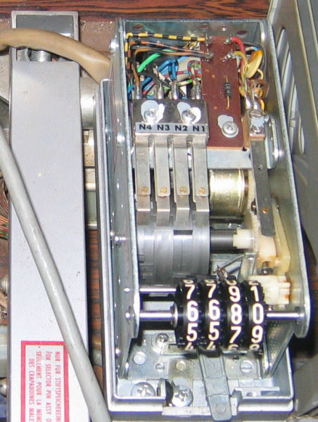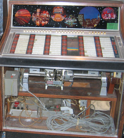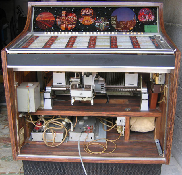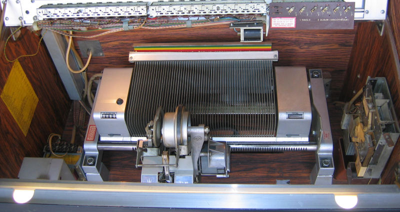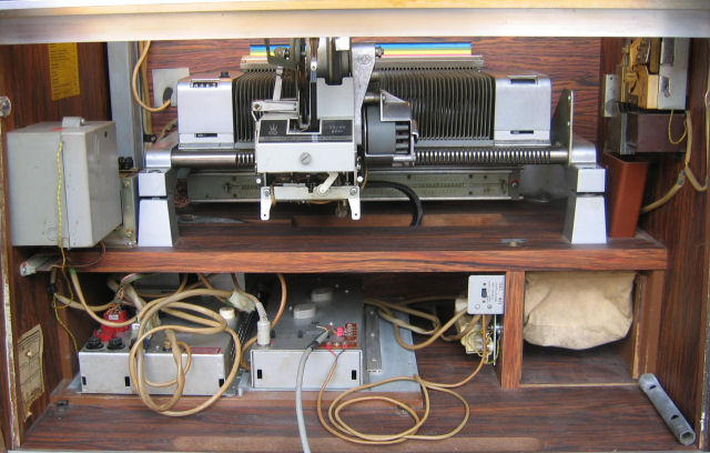 Le gros boîtier gris à gauche est le compteur de crédits, à droite le chariot avec le séquenceur et le totaliseur, le plateau de lecture, complètement à droite le monnayeur, puis en dessous à gauche le contrôle et à droite l'ampli.